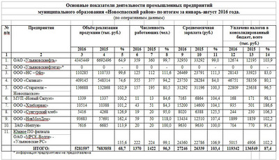 Согласно ежемесячного мониторинга финансово-хозяйственной деятельности промышленных предприятий района, можно сделать вывод о том, что в целом многие финансово-экономические показатели за январь-август 2016 года не выполнены по сравнению с аналогичным периодом 2015 г.