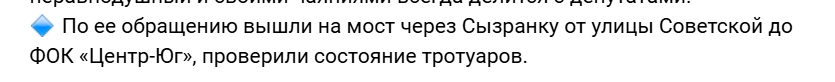 Кстати, очень показательно, без обращения одной из жительниц, эти "слуги" народа годами не замечали, в каком состоянии пешеходные зоны на мосту. Ну, правильно, они пешком не ходят у всех авто.