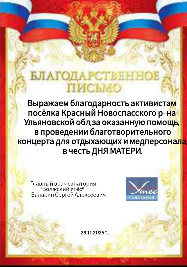 Активисты посёлка Красный провели концерт в санатории "Утёс", за проведённое мероприятие они получили благодарственное письмо.