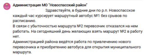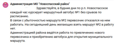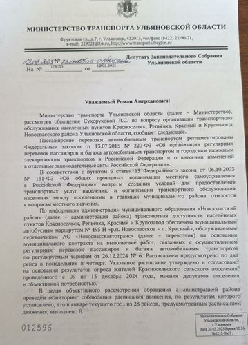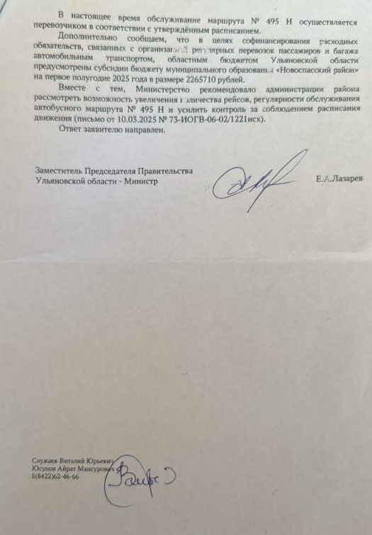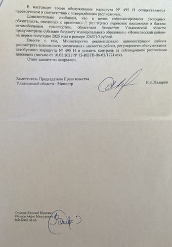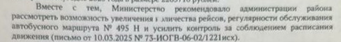 Так же в ответе министерства утверждается, что действующее расписание автобусов 2 раза в неделю было определено результатом опроса жителей поселения проведённого в декабре 2024 года (хотя, некоторые жители утверждают, что настаивали о трёх дневной частоте).