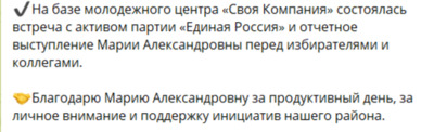 На Доме для молодых уже смело можно менять табличку на - конференц-зал "Единой России". Облюбовала эта партия бывший продуктовый ангар, который был переделан для молодых. Но, молодым там не место, такое сложилось впечатление, почти чуть ли не каждую неделю "Единая Россия" занимает его, и как уже портал писал, проводит в рабочее время свои форумы, совещания и прочие партийные мероприятия.