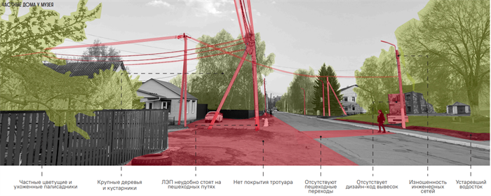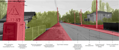 - по улице Мира такие недостатки отмечены, причём есть парадоксальные, учитывая что эту часть улицы совсем недавно реконструировали, "облагораживали", и так: отсутствует благоустройство и перепад высот; грунтовые заезды, нарушение целостности дорожной и пешеходной сети; узкие тротуары (где они есть); проблемы с водоотведением (!!!); старые инженерные сети (!!!); ЛЭП на пешеходном пути (!!!).