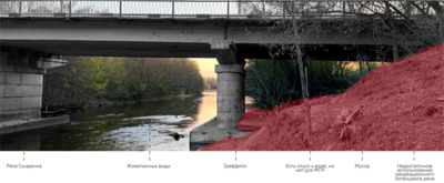 - на въезде в Новоспасское под жд мостом: нарушение целостности дорожной сети; отсутствие пешеходной и велосипедной дорожки, а в период паводка, там пешему человеку вообще невозможно пройти.