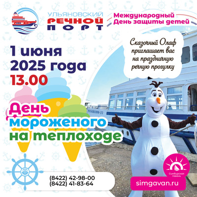 Традиционно в первый день лета Ульяновский речной порт вводит в расписание «Развлекательные рейсы», где в пути пассажиров ждет программа с участием артистов различного жанра, или музыкантов, или аниматоров. В Международный день защиты детей героем рейса в 13.00 станет сказочный Олаф, с которым можно сфотографироваться, снять видео и получить в подарок мороженое. В 15.00 пассажиров в пути ждет музыкальная программа.