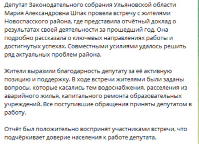 И ещё один характерный момент, она как-то случайно попутав группы попала в группу портала в одной из соцсетей, честно скажем, что встреча её там была не такой, как в "Кристалле" (но это надо было предвидеть, группа то не администрации района), и она не долго продержалась, к сожалению. Думается, что тоже знаковый показатель, особенно для депутата.