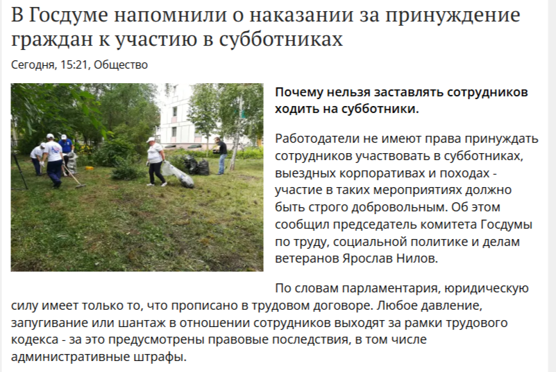 Хорошая новость из Госдумы РФ, хотя это скорее не новость, а просто напоминание некоторым зарвавшимся администраторам и руководителям. Может быть хоть в этот раз отрезвляюще подействую эти слова на наших горе-администраторов и руководителей, а также на местные СМИ, которые, наверное тоже следовало бы штрафовать за рекламирование и откровенное участие в принуждении работников (вспомните, например, любимый лозунг "Сферы" - "Хорошие работники всегда на субботнике"). Ведь именно так, как сказал Ярослав Нилов, в Новоспасском районе происходят все этих, так пародийно называемые "экофестивали" - новое словечко в сленге администрации района. Портал давно бьёт в колокола, что такими действиями районной администрацией, руководством "Проминвеста" и других предприятий и организаций, попросту попираются Конституция и Трудовой кодекс РФ. И никакими "патриотическими" лозунгами и лицемерными призывами это оправдать нельзя. Они нарушители законов! Точка, как любят сейчас говорить. | |