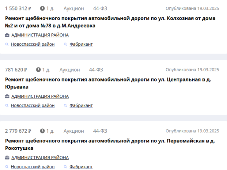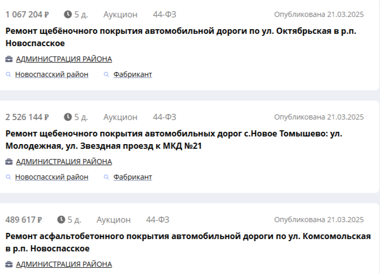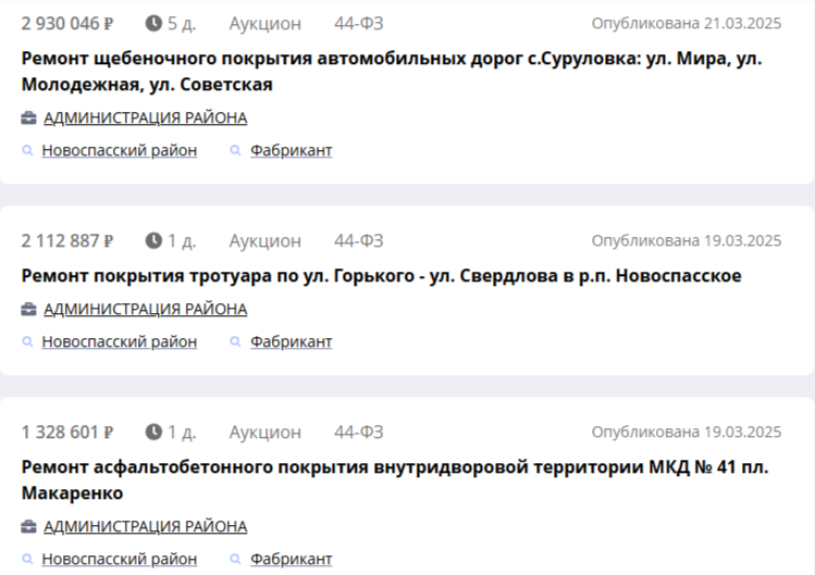 Причём, обратите внимание, есть тендеры с довольно приличными суммами от 1,5 до 3 млн. рублей.