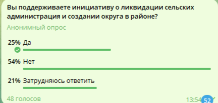Как видим, большинство высказалось против ликвидации сельских администраций и сельсоветов. Как это будет выглядеть на самом деле, если вроде бы глава администрации за ликвидацию, а население против, и при этом область переходит на одноуровневую систему управления, - на наш взгляд будет правовая коллизия.