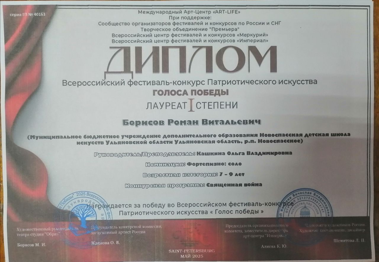 Учащийся Новоспасской ДШИ Борисов Роман стал лауреатом I степени Всероссийского фестиваля-конкурса Патриотического искусства "ГОЛОСА ПОБЕДЫ" в номинации фортепиано (соло).