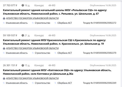 На ремонт Репьёвской начальной школы собираются потратить 37 703 077 ₽; на капитальный ремонт здания МОУ Красносельская СШ - 59 109 937 ₽; на капитальный ремонт здания МОУ «Коптевская ОШ» - 26 301 151 ₽.