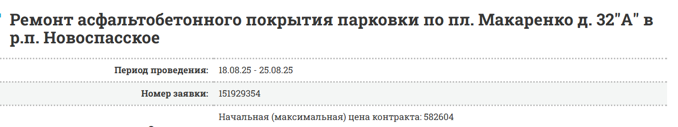 Объявлен тендер на ремонт асфальтобетонного покрытия парковки по пл. Макаренко д. 32"А" в р.п. Новоспасское.