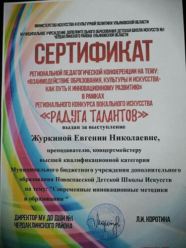 Журкина Евгения Николаевна поделилась опытом работы на региональной педагогической конференции "Взаимодействие образования, культуры и искусства как путь к инновационному развитию", которая состоялась 6 декабря в рамках регионального конкурса вокального искусства "Радуга талантов".