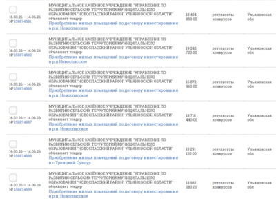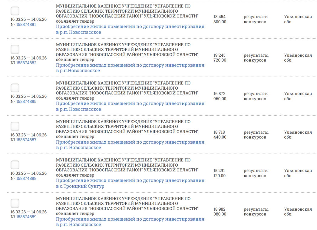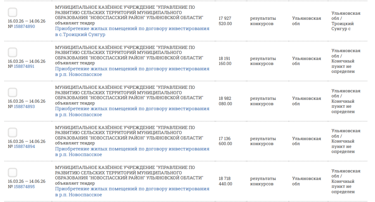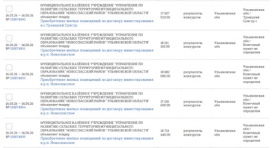 МУНИЦИПАЛЬНОЕ КАЗЁННОЕ УЧРЕЖДЕНИЕ "УПРАВЛЕНИЕ ПО РАЗВИТИЮ СЕЛЬСКИХ ТЕРРИТОРИЙ МУНИЦИПАЛЬНОГО ОБРАЗОВАНИЯ "НОВОСПАССКИЙ РАЙОН" УЛЬЯНОВСКОЙ ОБЛАСТИ"разместило целый поток тендеров на приобретение жилых помещений по договору инвестирования в р.п.Новоспасское и селе Троицкий Сунгур.