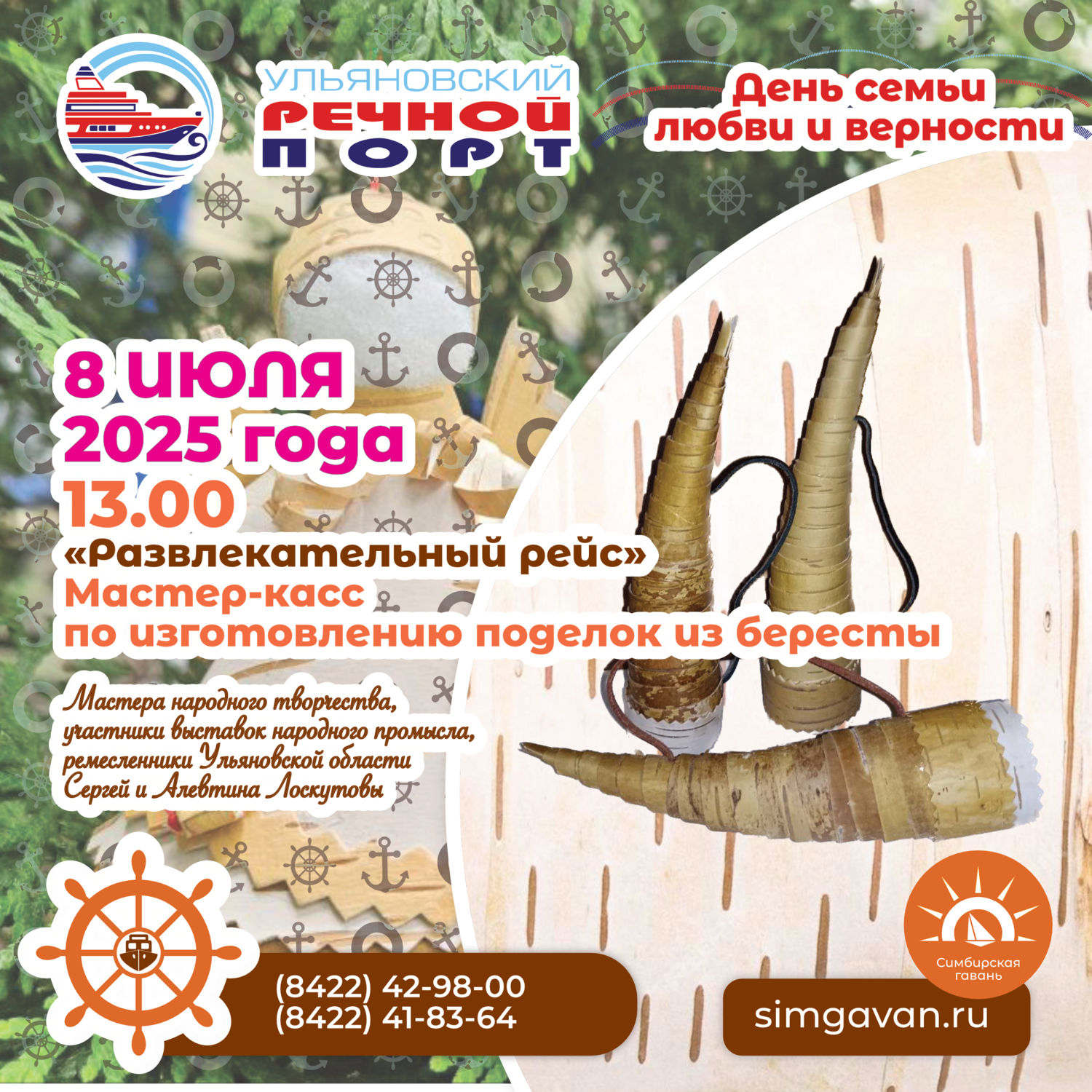 8 июля 2025 года в 13.00 час., от причала Ульяновского речного порта отправится специальный «Развлекательный рейс». В пути пассажиров ждет мастер-класс для детей по изготовлению изделий из бересты под руководством мастеров народного творчества, участников выставок народного промысла, известных ремесленников Ульяновской области Сергея и Алевтины Лоскутовых.