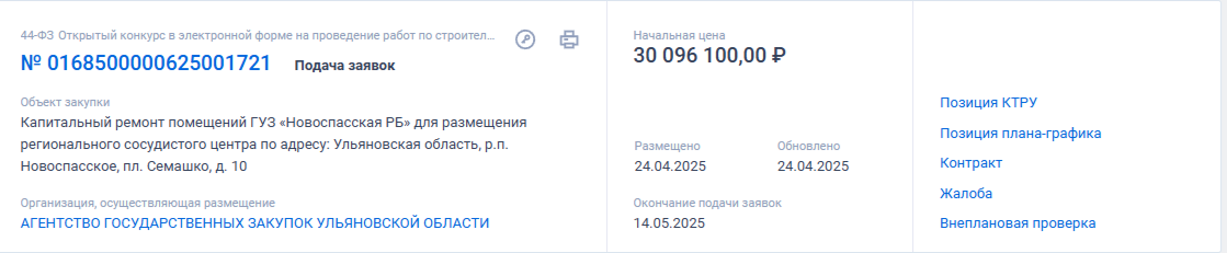 Здесь планируют разместить региональный сосудистый центр. Стоимость работ оценили в 30 млн рублей. Прием заявок от желающих участвовать в аукционе продлится до 14 мая.