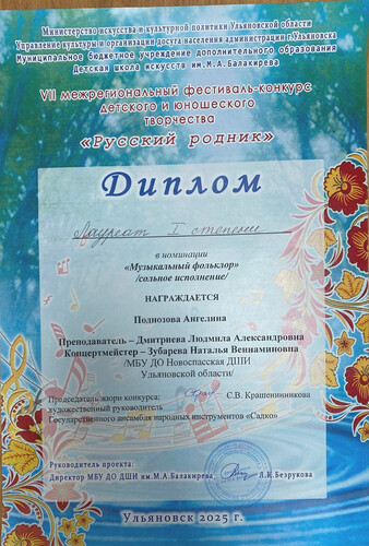 Поднозова Ангелина стала лауреатом I степени в номинации 'Музыкальный фольклор".