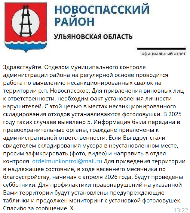 Глава администрации не понял, чем портал недоволен в ответе. Пришлось объяснять - что это форменная отписка, без конкретных мер (кроме субботников весной 2026 года), представляете, ещё полгода предлагается полежать мусору в посадке! Это административно-управленческий подход? Да за полгода там ещё вырастут горы мусора.