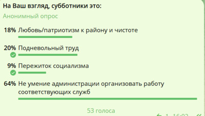А что касается субботников, так любимых администрацией и Смольковой, то вот результат опроса, который проводит портал: