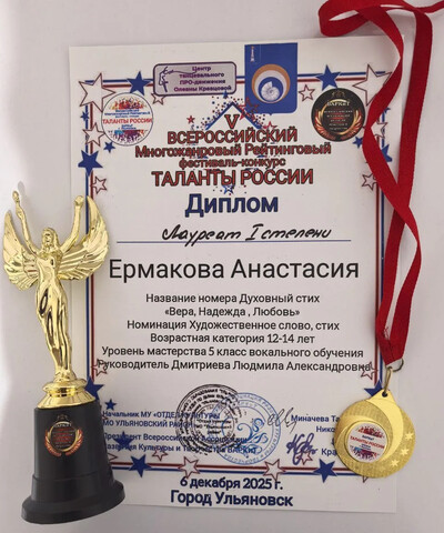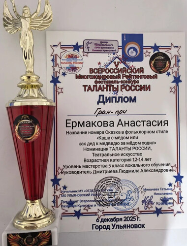За номер "Сказка в фольклорном стиле" Каша с мёдом или как дед к медведю за мёдом ходил" Анастасия получила самую высокую награду —ГРАН-ПРИ; за Духовный стих "Вера. Надежда. Любовь" - диплом лауреата I степени!