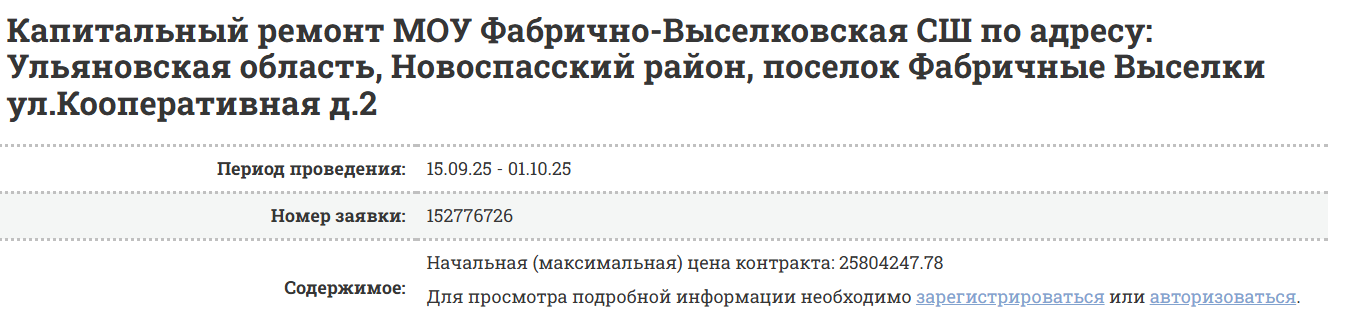 АДМИНИСТРАЦИЕЙ МУНИЦИПАЛЬНОГО ОБРАЗОВАНИЯ "НОВОСПАССКИЙ РАЙОН" УЛЬЯНОВСКОЙ ОБЛАСТИ объявлен тендер на капитальный ремонт МОУ Фабрично-Выселковская средней школы.
