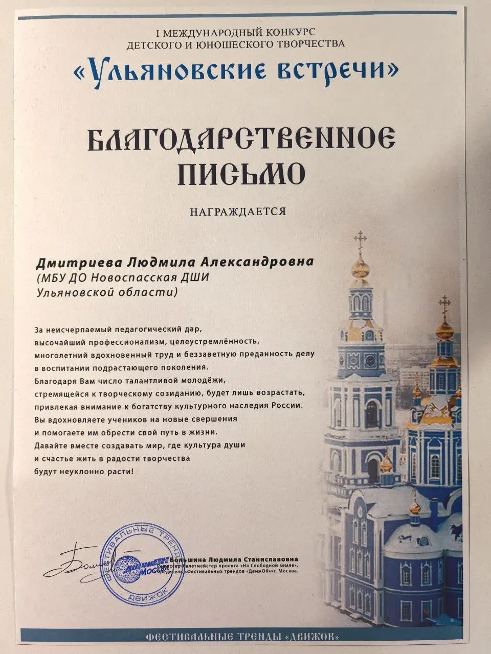 Преподаватель Новоспасской ДШИ Дмитриева Людмила Александровна получила Благодарственное письмо.