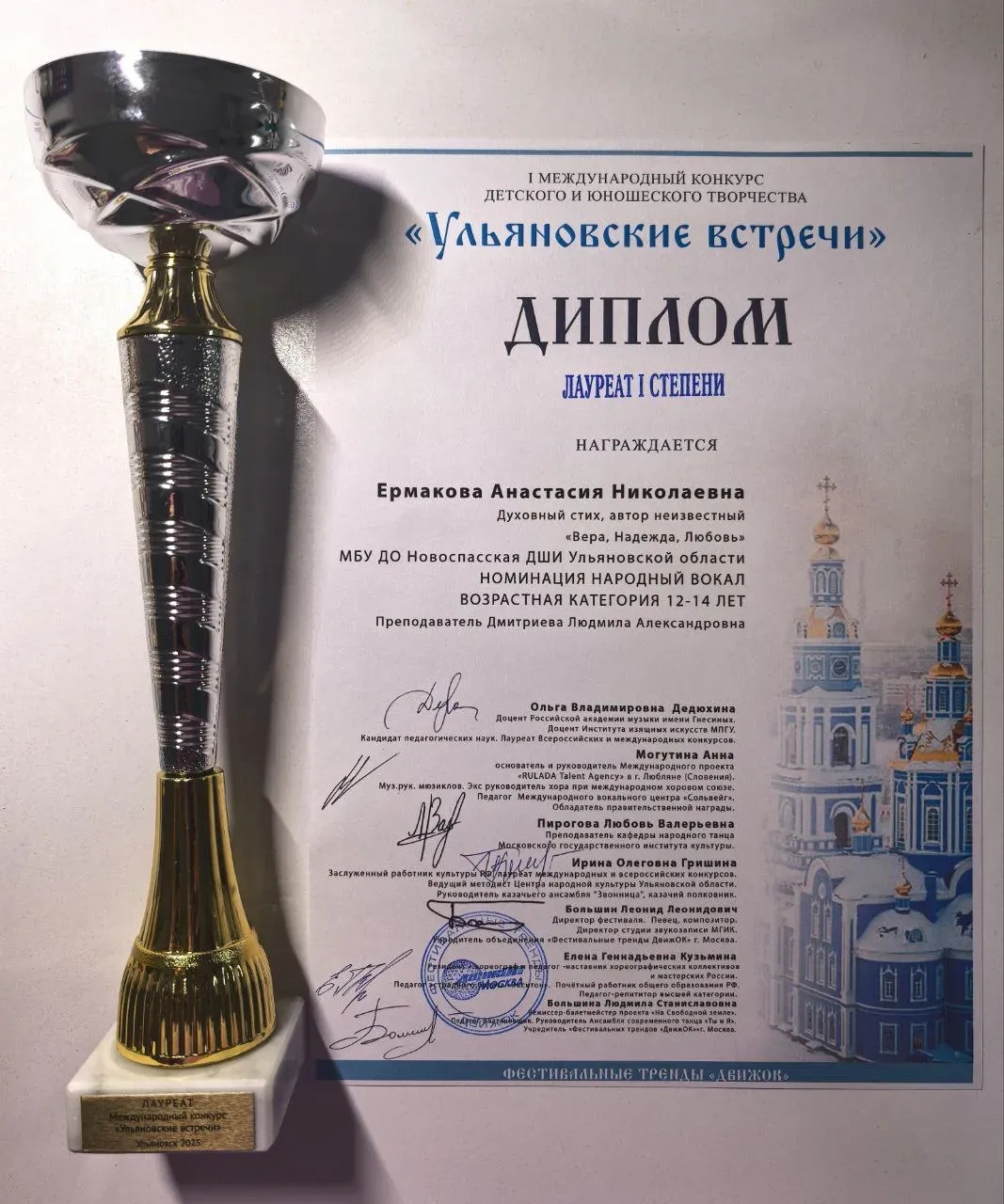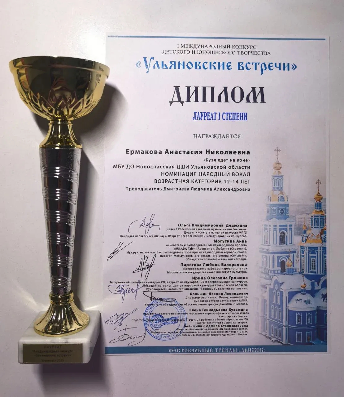 Ермакова Анастасия стала дважды лауреатом I степени I Международного многожанрового конкурса детского и юношеского творчества "Ульяновские встречи" и была награждена дипломом за лучшее оформление сценического номера.