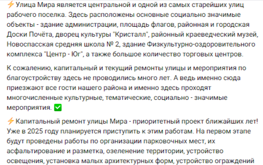 Но, самое интересное, нигде, ни на каком уровне об улице Мира речи не велось, ни при визите Губернатора, ни на правительственном совещании. Откуда вдруг она возникла? Да, летом были разговоры, но как тогда говорилось - это перспектива, и её срок неизвестен, в отличие от улицы 40 лет Победы и ремонта ЦДТ. Вот и получается, что сбор средств появился ниоткуда... Ну и традиционно, денежки предлагают переводить на карту частного лица... Очень интересная финансовая составляющая.