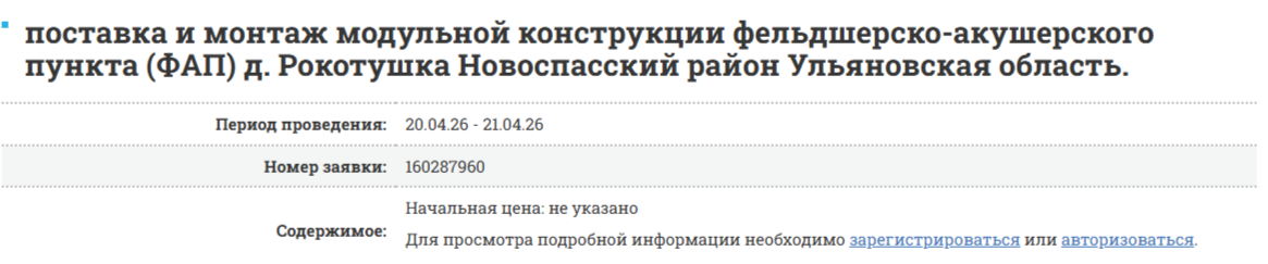Администрация района объявила тендер на поставку и монтаж модульной конструкции фельдшерско-акушерского пункта (ФАП) в деревне Рокотушка (на фото пример такого ФАПа). Правда в заявке почему-то то ли забыли, то ли целенаправленно, не указали начальную цену. Изучив на просторах интернета данную опцию, выяснили, что стоимость одноэтажного модульного ФАП от 2,5 до почти 5 млн. рублей. Но ещё удивительным моментом является тот, что тендер заканчивается сегодня, т.е. продолжительность заявок всего 2 дня была. Видимо под кого-то конкретного такой срок установлен, так так физически конкуренты вряд ли смогли всё оформить за столь короткое время.