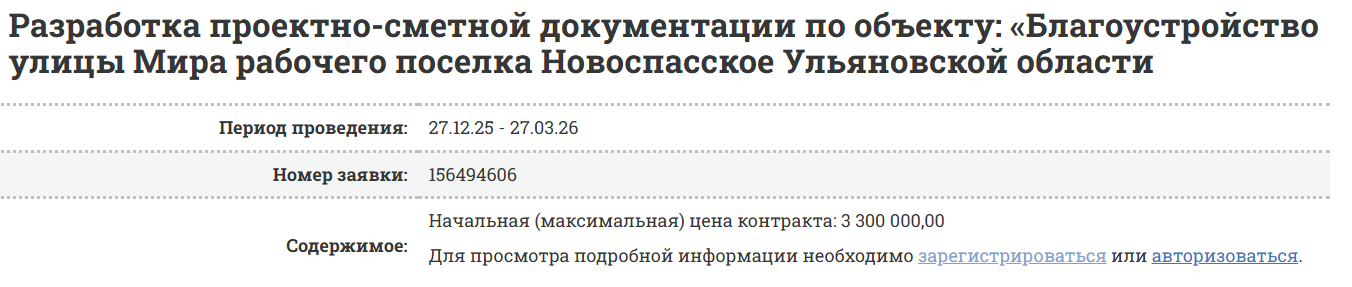 Кстати, в конце 2025 года, администрацией района в очередной раз был объявлен конкурс на разработку проектно-сметной документации по объекту: «Благоустройство улицы Мира рабочего поселка Новоспасское". К тому же в этот раз конкурс объявлен долгоиграющим - аж до 27.03.26 г. Видимо, в администрации поняли, что предыдущие тендеры с 10-ти дневным сроком не котируются у солидных проектировщиков.
