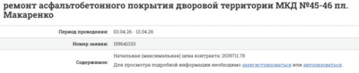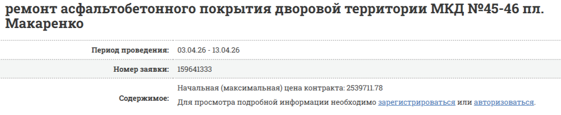 Тендер на "Ремонт асфальтобетонного покрытия дворовой территории МКД №45-46 пл. Макаренко" стартует от суммы в :2539711.78 руб.