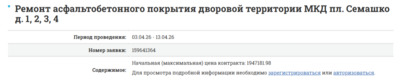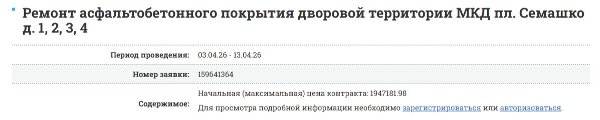 Тендер на "Ремонт асфальтобетонного покрытия дворовой территории МКД пл. Семашко д. 1, 2, 3, 4" оценен на сумму в 1947181.98 руб.