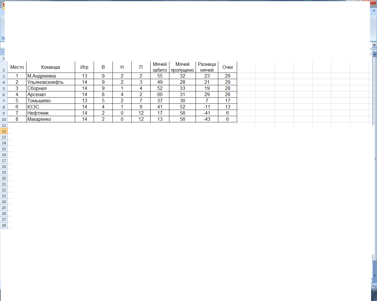 | таблица все плотно борьба за 1,2,3 место будет вестись до последнего тура который состоится 04.11.10г. Добавлено (28.10.2010, 21:00) --------------------------------------------- арсенал -с.ст.Томышево 2-2 Добавлено (29.10.2010, 20:08) --------------------------------------------- ЮЭС -м.Андревка 5-6