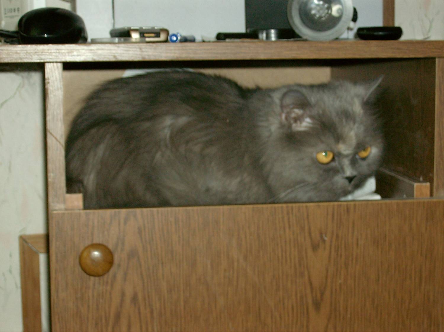 | только я вынул ящик из стола, чтобы привести его содержимое в порядок, как наша любимица - "Масяня" забралась в освободившееся место