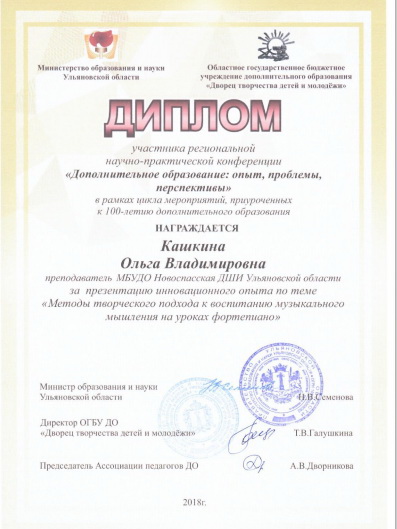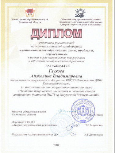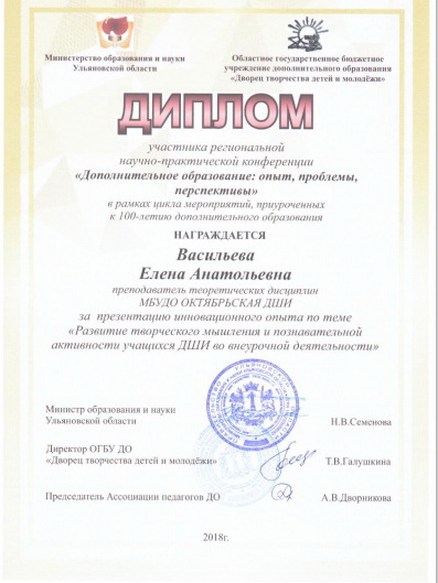 Преподаватели Новоспасского межрайонного методического объединения: Кашкина Ольга Владимировна, Глухова Анжелика Владимировна (Новоспасская ДШИ), Васильева Елена Анатольевна (Октябрьская ДШИ) приняли участие в региональной научно-практической конференции "Дополнительное образование: опыт, проблемы, перспективы" в рамках цикла мероприятий, приуроченных к 100-летию дополнительного образования.