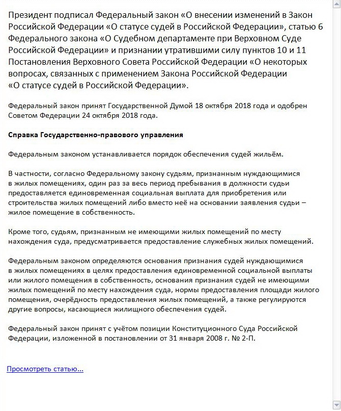 В связи с подписанным, Президентом Российской Федерации, Федеральным законом "О внесении изменений в Закон Российской Федерации "О статусе Судей
