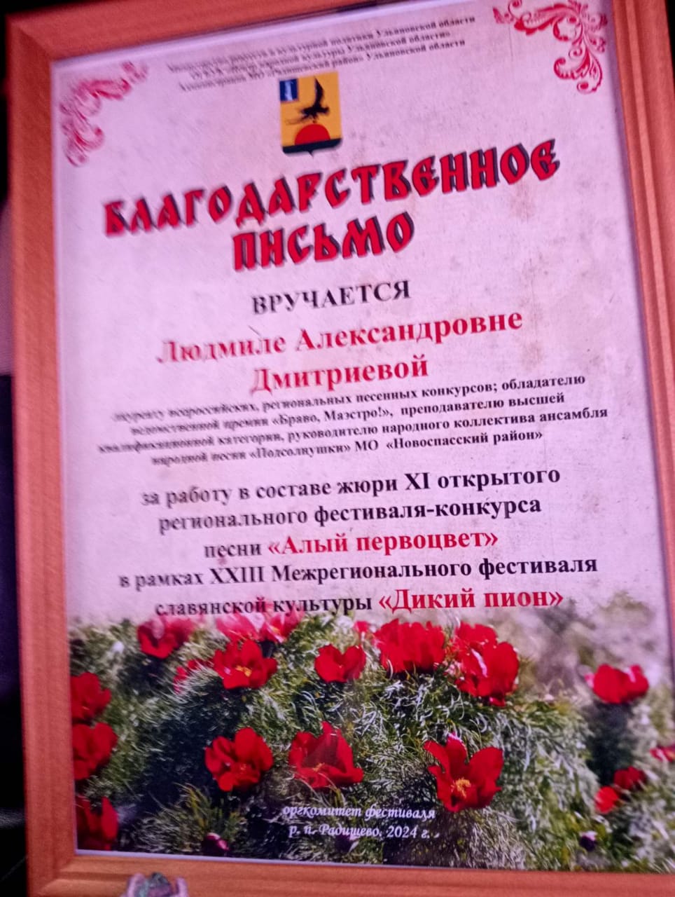 Дмитриева Людмила Александровна, преподаватель вокала Новоспасской ДШИ, приняла участие в составе жюри XI открытого регионального фестиваля-конкурса песни "Алый первоцвет" в рамках XXIII межрегионального фестиваля славянской культуры "Дикий пион", который состоялся в р. п. Радищево 18 мая 2024 года.