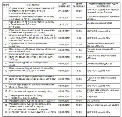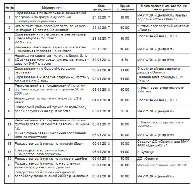 План спортивно-массовых мероприятий в период Новогодних каникул с 27.12.17 по 09.01.2017 г.