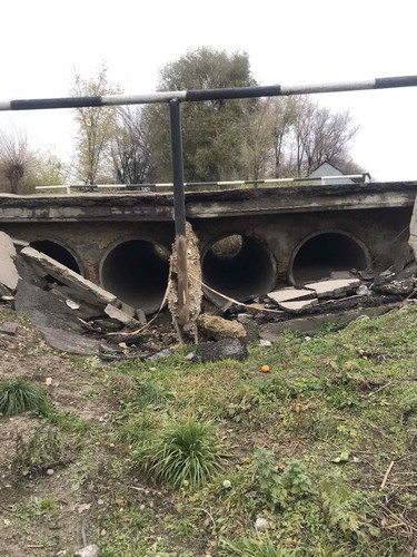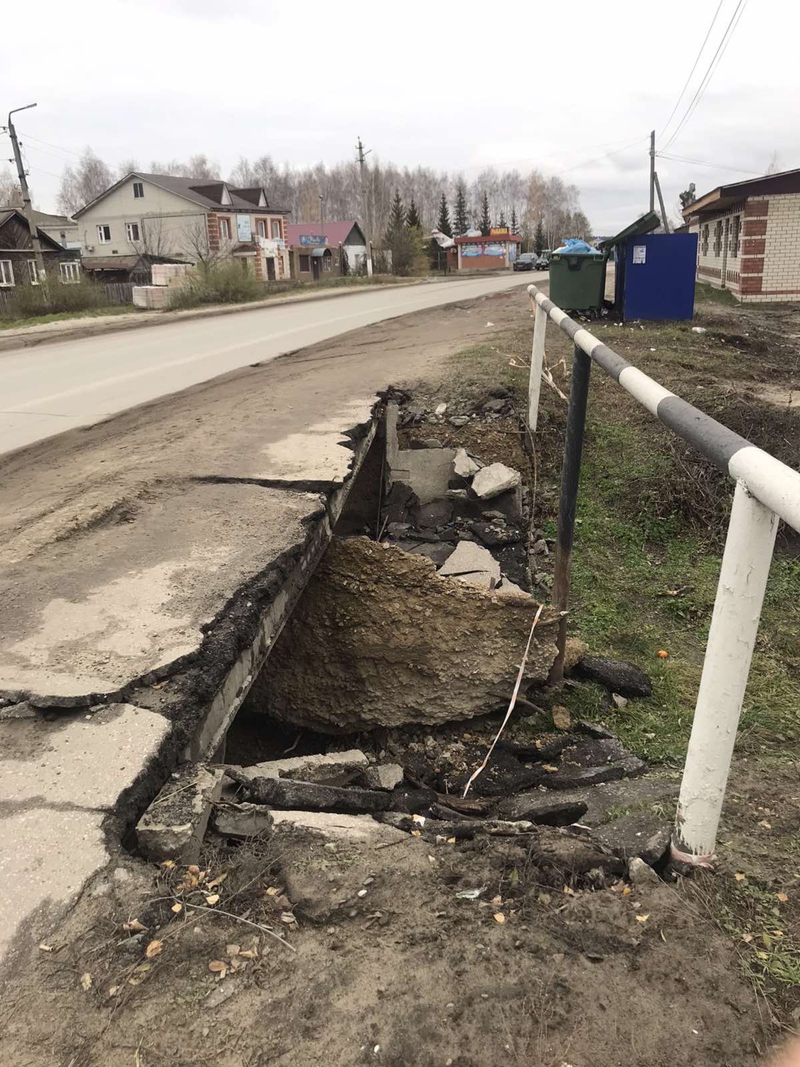Железобетонный мост видимо от своих преклонных лет (ему более 50 лет), точнее его пешеходная часть разрушилась.