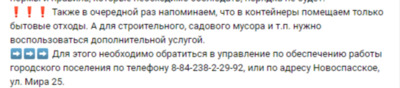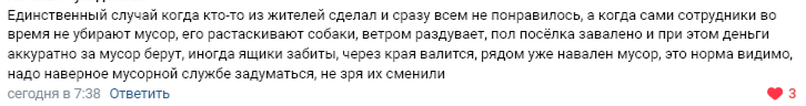 Пока ещё неустановленными лицами на легковой автомашине был свален мусор возле контейнеров (есть запись видеонаблюдения). Что это было, сказать трудно пока. Может быть действительно какая-то показательная акция. Если это так, то цели она своей достигла, причём не той, о которой подумали местные СМИ и некоторые руководящие сотрудники администрации.