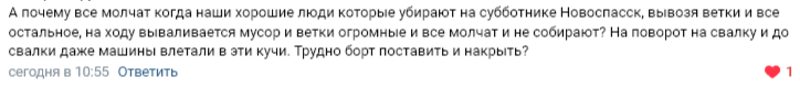 Есть и светлое пятно в этой истории, не все затуманены словесной болтовнёй Николая Дудочкина и Сферы, есть те, кто так и говорит - посмотрите сначала на себя господа, а уж потом возмущайтесь, что кто-то выбросил мусор у вас под носом, видимо у людей просто накипело и они таким образом решили показать администрации их место. Да, безусловно акция показательная, белым днём при прохожих...
