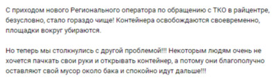 Первое: переполненные два контейнера (их ни Дудочкин, ни Сфера не заметили). То есть на лицо в очередной раз всем показали, что администрация за месяц так и не просчитала необходимое количество контейнеров на каждой площадке! А раз не просчитали, то естественно и не поставили задачу перед регоператором о пополнении их на площадках. Чья вина в этом случае - однозначно администрации района.
