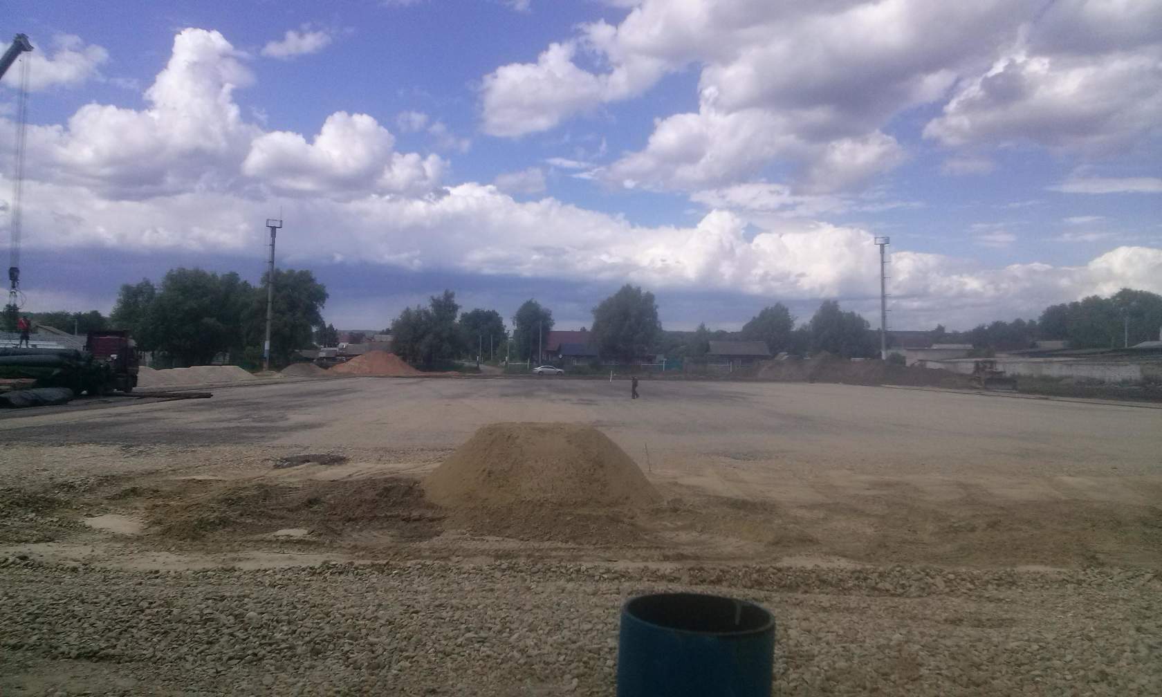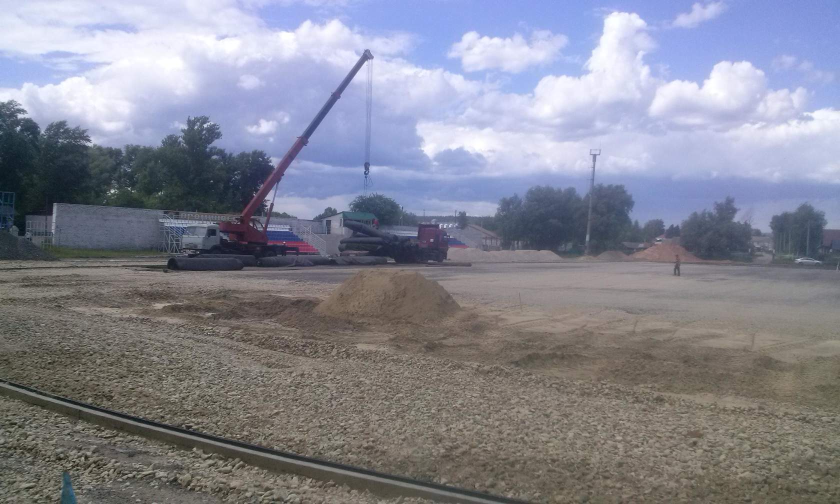Итак, на Центральном стадионе Новоспасского происходит "дубль два" - второй раз расстилают искусственное покрытие поля.
