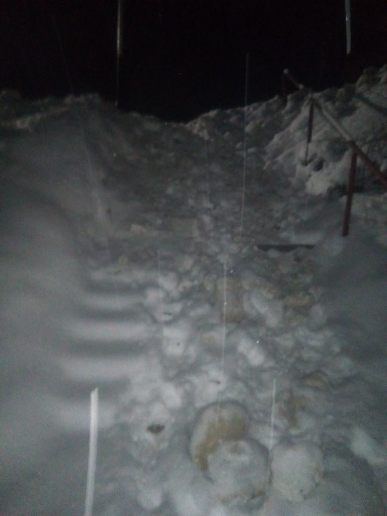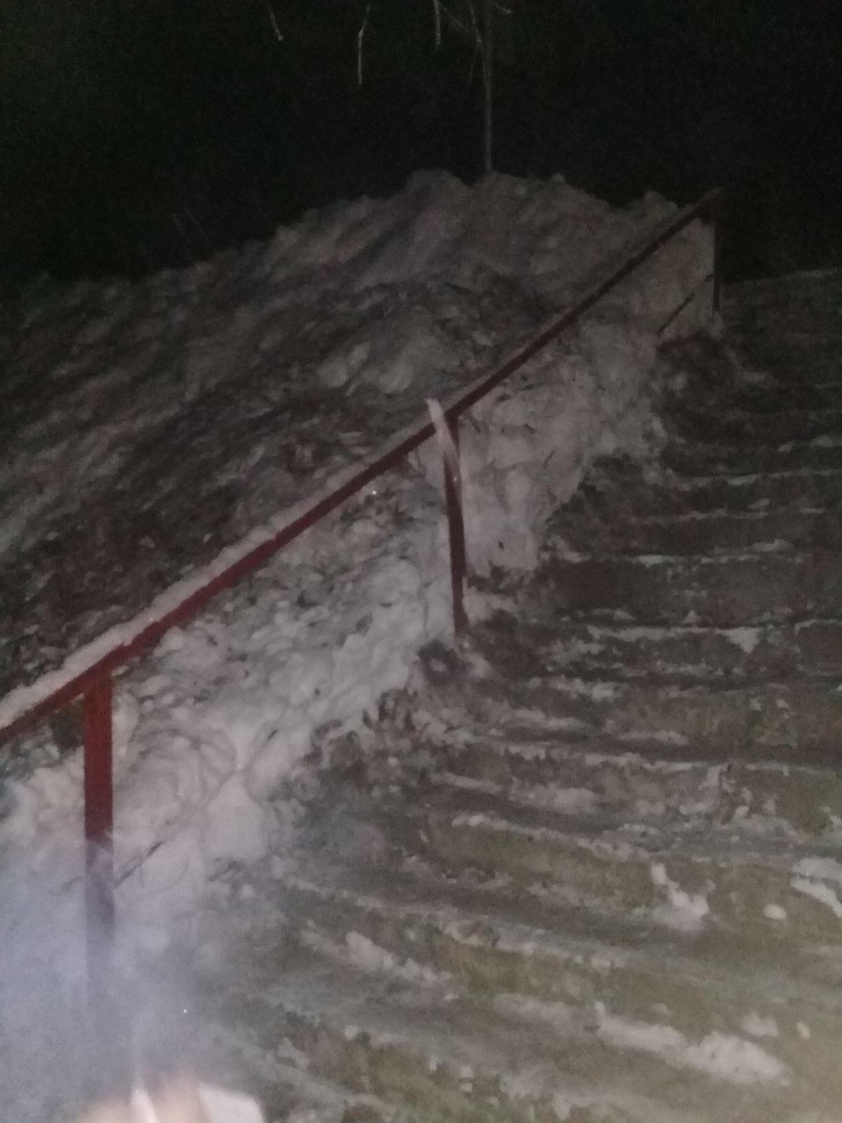 "Вот так вот работают наши коммунальные службы, дети не могут пройти в школу с улицы Набережной, так как почистили дорогу и всё сбросили на лестницу, два дня жители вползали в гору, терпения не хватило, муж пришел с работы не дождался продвижения пошел чистить лестницу, т.к. беспокойство больше за детей и пожилых людей, 13.01.2021 г. 21 час 30 минут, мороз -20°.