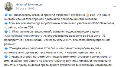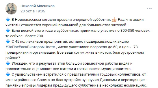 Опять - таки, ну хорошо, понятно, что существующие коммунальные предприятия не в состоянии не в материальном плане (нет достаточного количества необходимой техники), ни в физическом (нет работников нужного количества) справиться с существующим объёмом работ. Ну, если господин Мясников такой "благодетель", как преподносит та же райадминистрация, почему не придёт в голову мысль создать коммунальную организацию в рамках Проминвеста (по примеру "Новограда") и на ежедневной и постоянной основе приводить в порядок посёлок, уверен, что подобная организация сделает гораздо больше и качественнее, чем все, так называемые "субботники". Но, при создании подобной организации уйдёт и пиар, местным СМИ уже не придётся на перебой заполнять соцсети о "героической" борьбе с мусором и кустарниками, не придётся и награждать кого-то за "бросания на амбразуру" сухой травы. Да и "слава" главного дворника тоже угаснет.