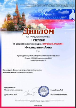 Поздравляем с успешным дебютом Иналишвили Анну, учащуюся 1 класса художественного отделения, получившую диплом 1 степени Всероссийского конкурса "Гордость России".