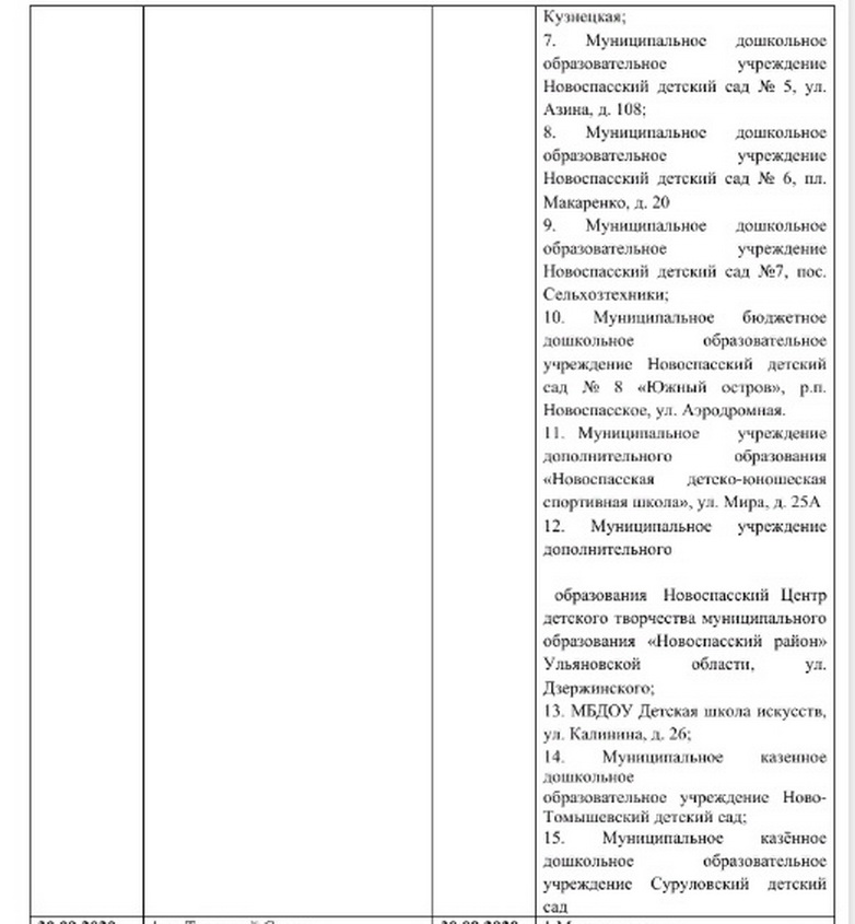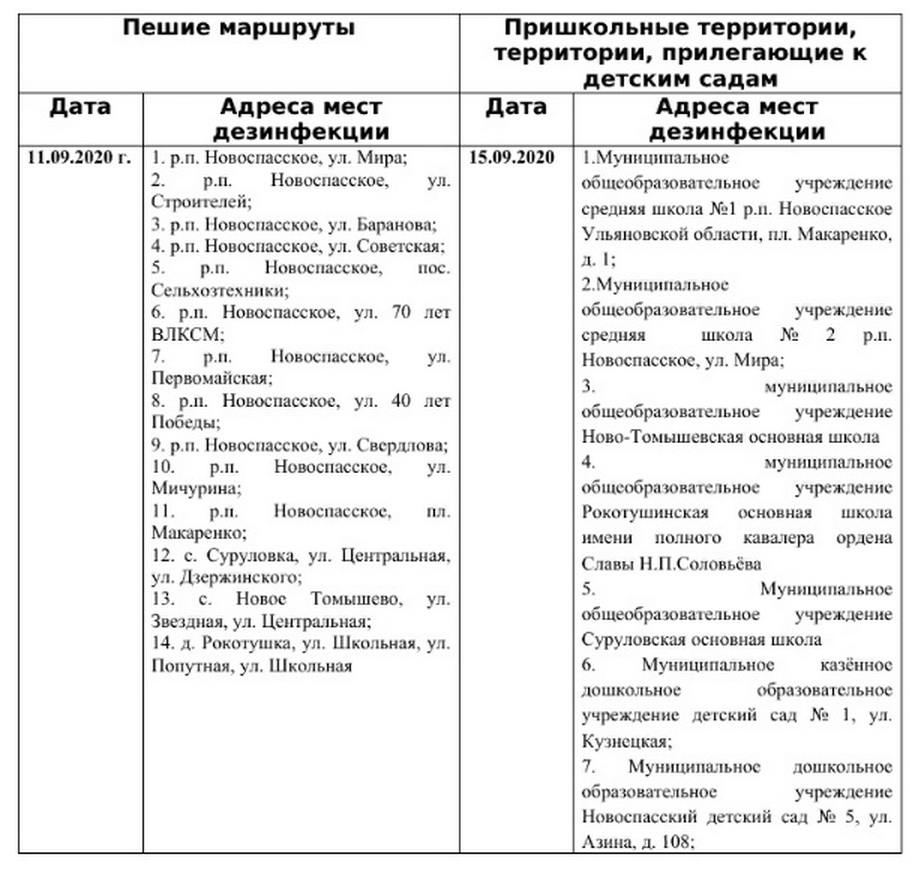 В рамках недопущения распространения коронавирусной инфекции, администрацией МО «Новоспасский район» совместно с Новоспасским центром ветеринарии и безопасности продовольствия, МБУ «Юг-Сервис» МО «Новоспасское городское поселение» Новоспасского района Ульяновской области, начиная с 11 сентября 2020 года будут продолжены работы по дезинфекции школьных пеших маршрутов, а также пришкольных территорий и территорий, прилегающих к детским садам в соответствии с графиком.