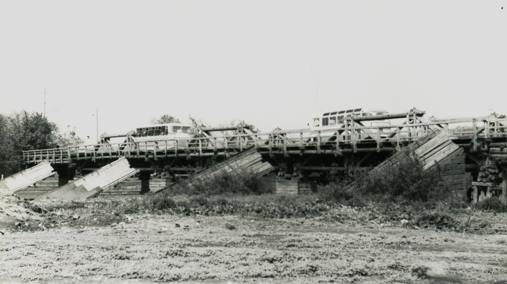 Но, в противовес предыдущему фото есть другие фотографии 1960 года, на которых запечатлено строительство "нового" деревянного "казённого" моста и его запуск в эксплуатацию в том же году.
