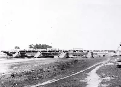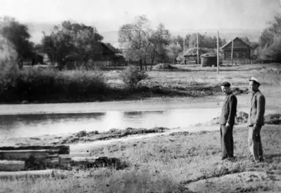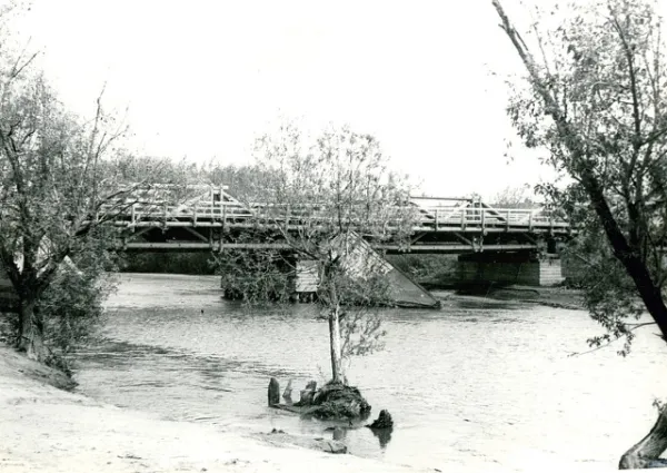По всей видимости первый мост просуществовал до 1950х годов. А вот дальше тоже запутанная история. Есть фото 1953 года (если, конечно, верно указана дата), на котором угадываются контуры того самого деревянного "казённого" моста, который помнят люди старшего поколения.