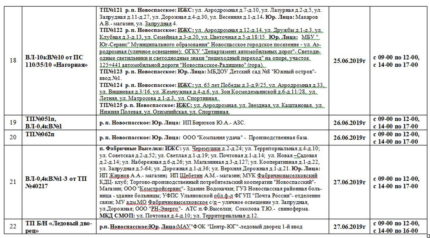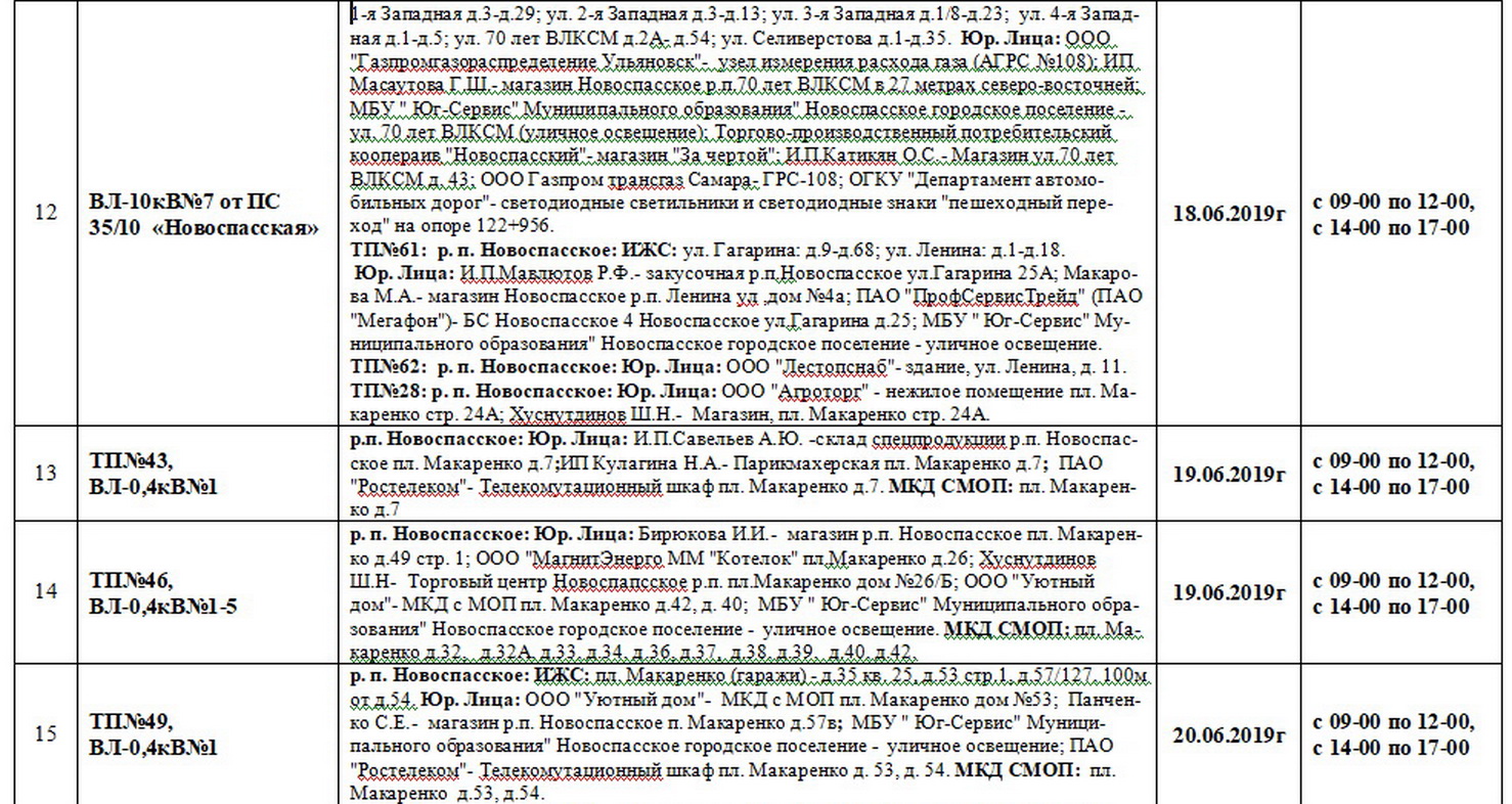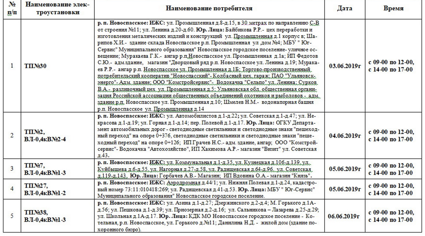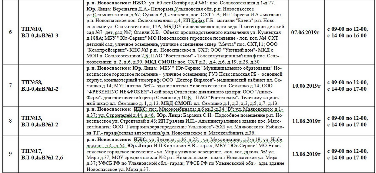 Планы ремонтов РЭС Новоспасского района для проведения ремонтных работ в июне месяце 2019 г.