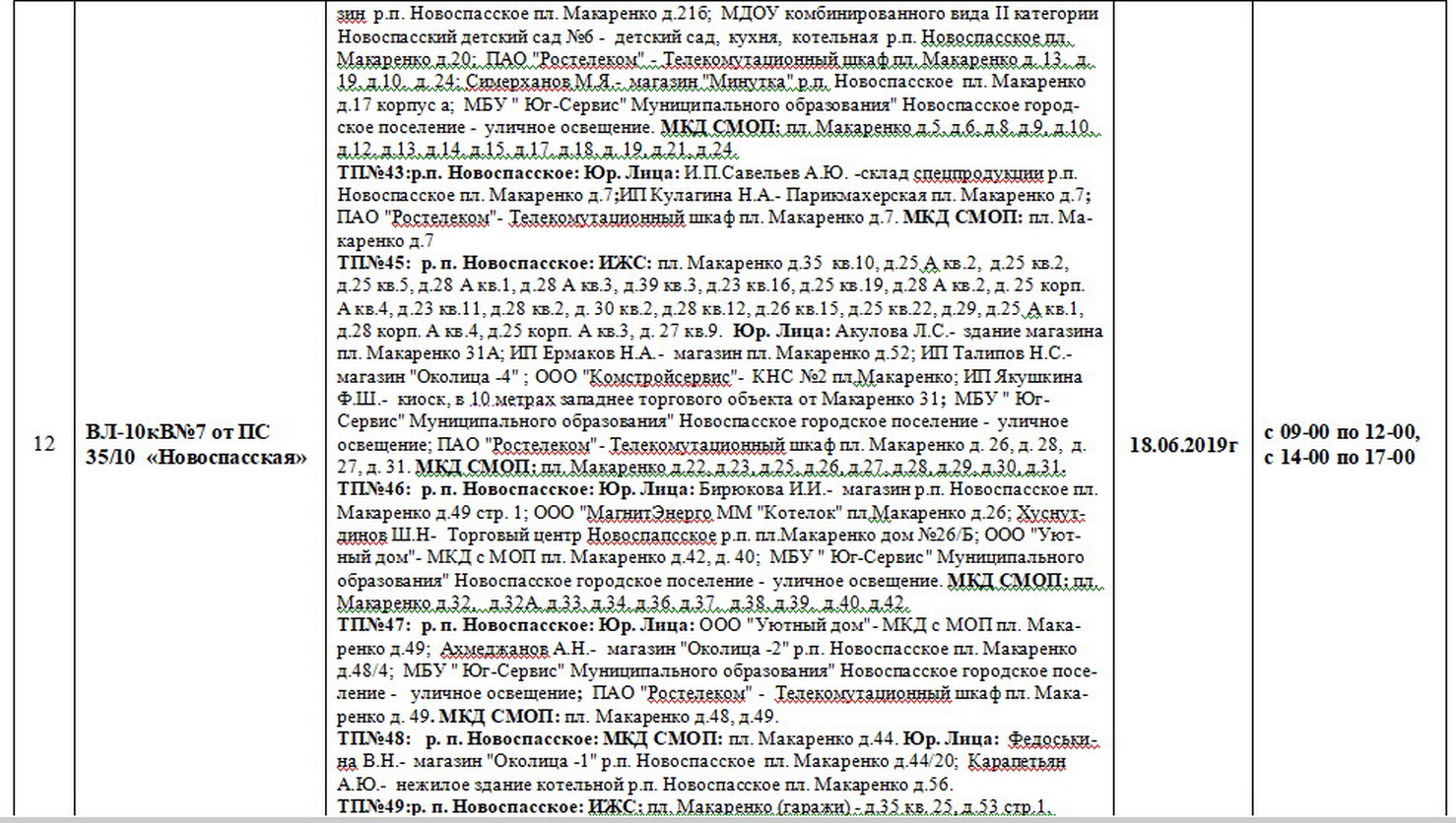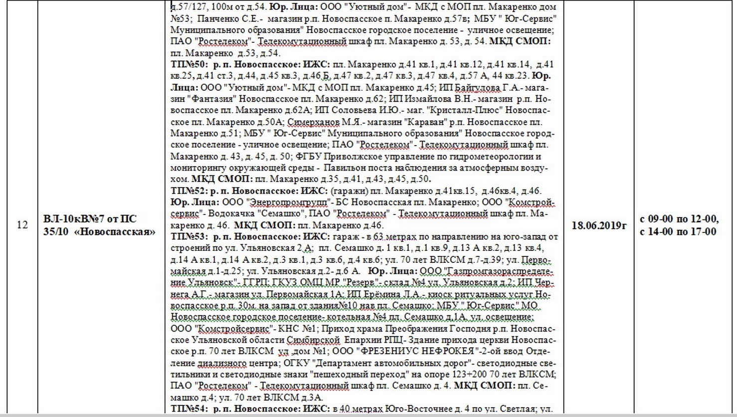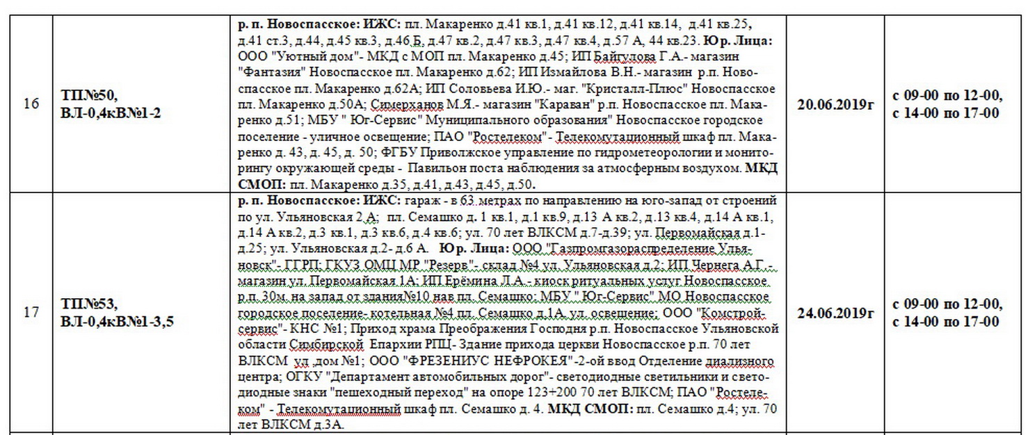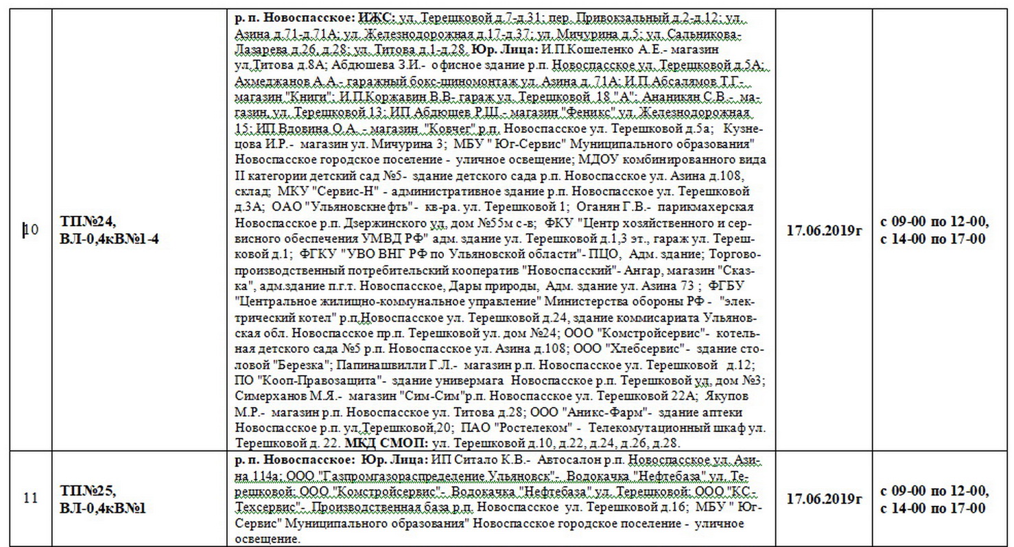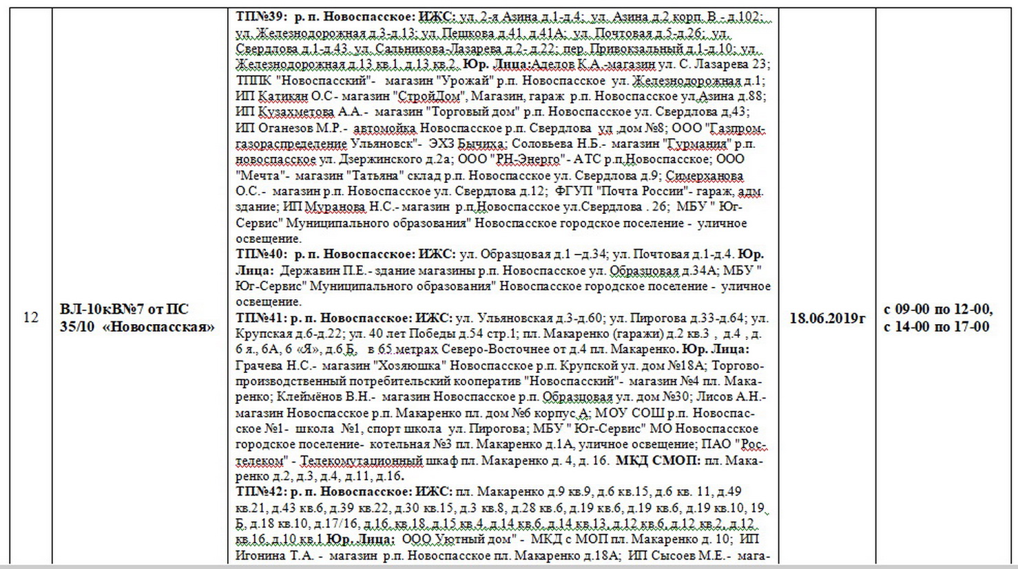 Планы ремонтов РЭС Новоспасского района для проведения ремонтных работ в июне месяце 2019 г.